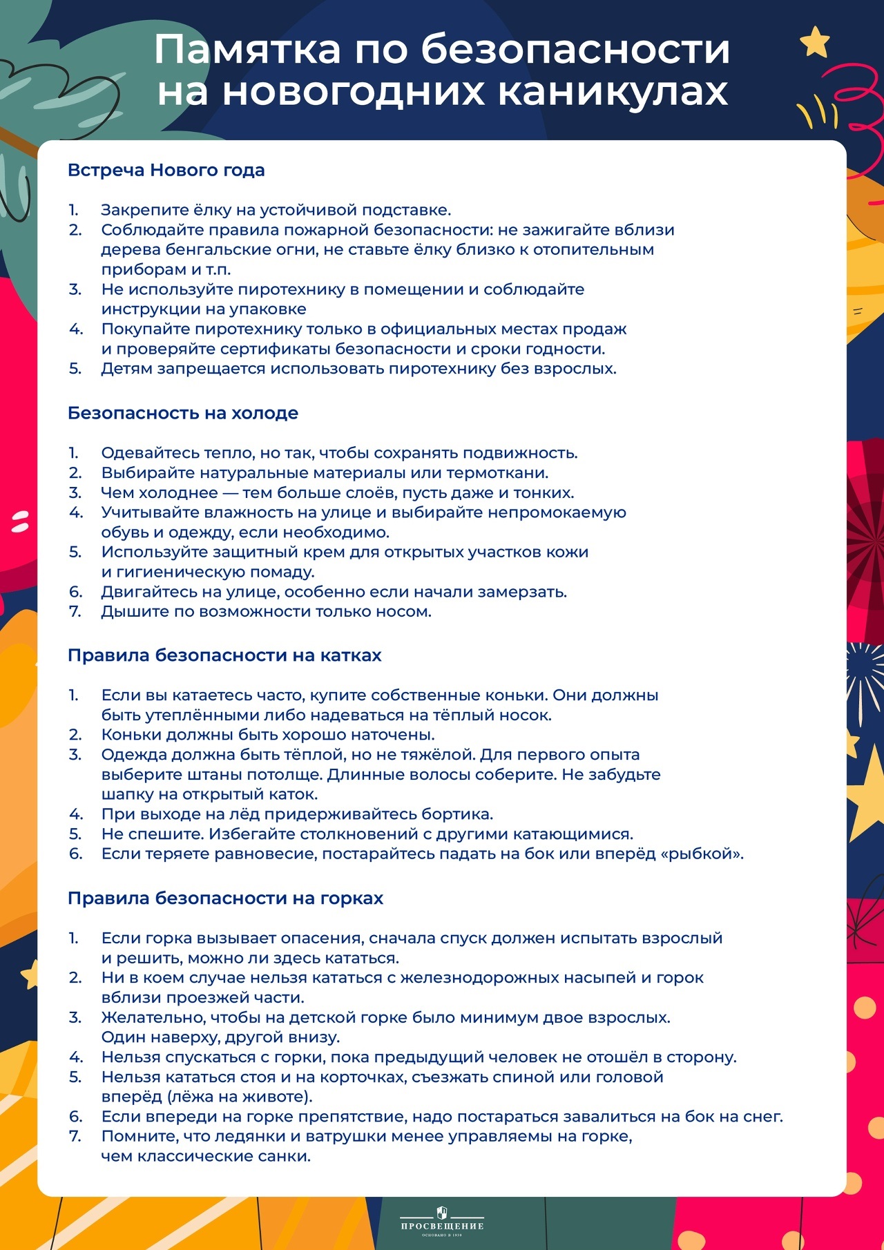 Пусть новогодние каникулы будут безопасными! В этом поможет памятка с простыми правилами: безопасность при встрече Нового года, поведение на горках и катках, а также моменты, которые надо учесть при прогулке в мороз.